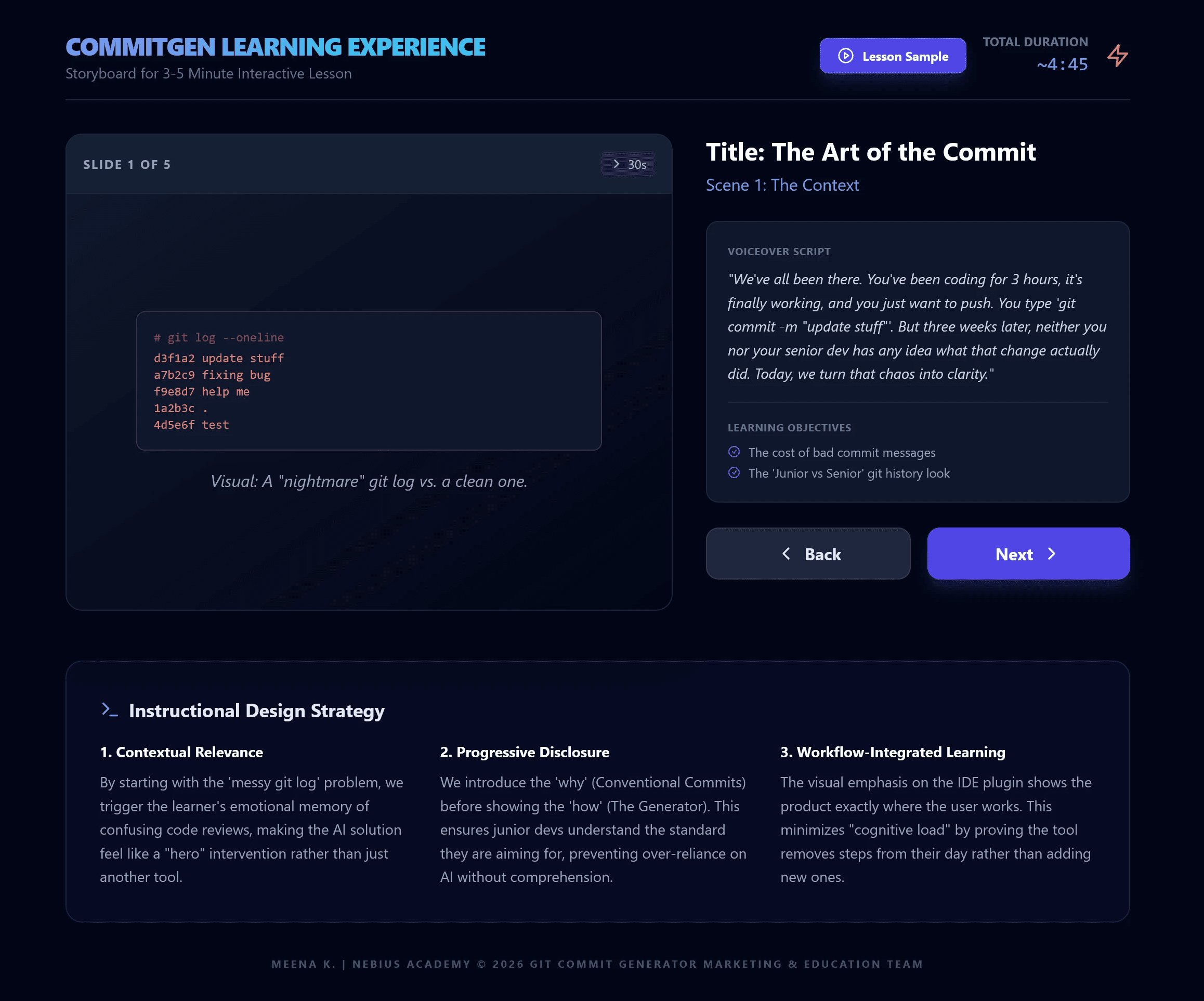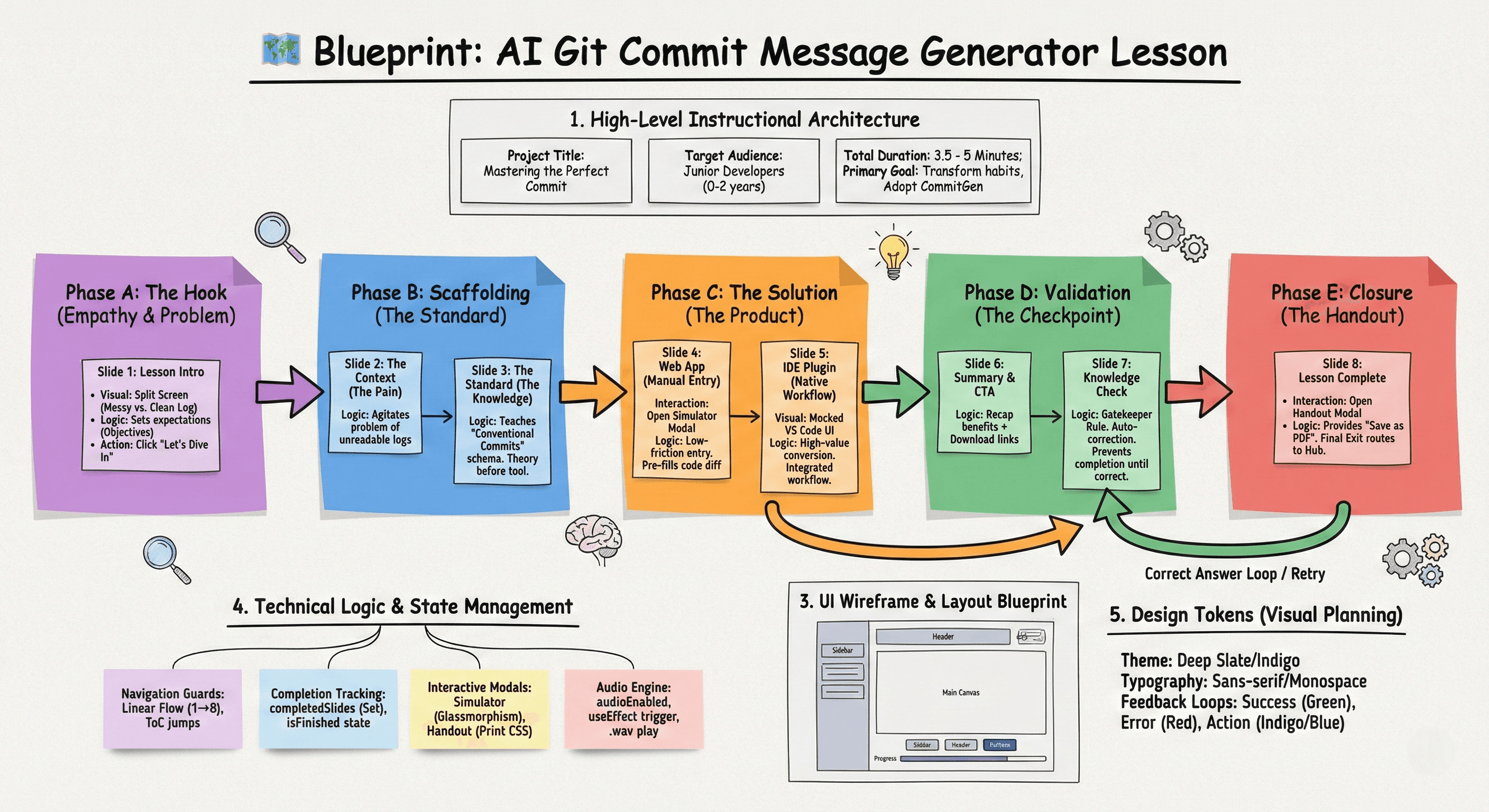 The approach centres on a Problem-Agitation-Solution (PAS) framework specifically tailored for junior developers. By starting with the "pain" of a messy git history, we establish immediate relevance. The lesson then scaffolds from the concept of Conventional Commits to the practical application using the AI tool across both web and IDE environments. This ensures the learner doesn't just see a product pitch, but gains a professional skill they can use immediately.