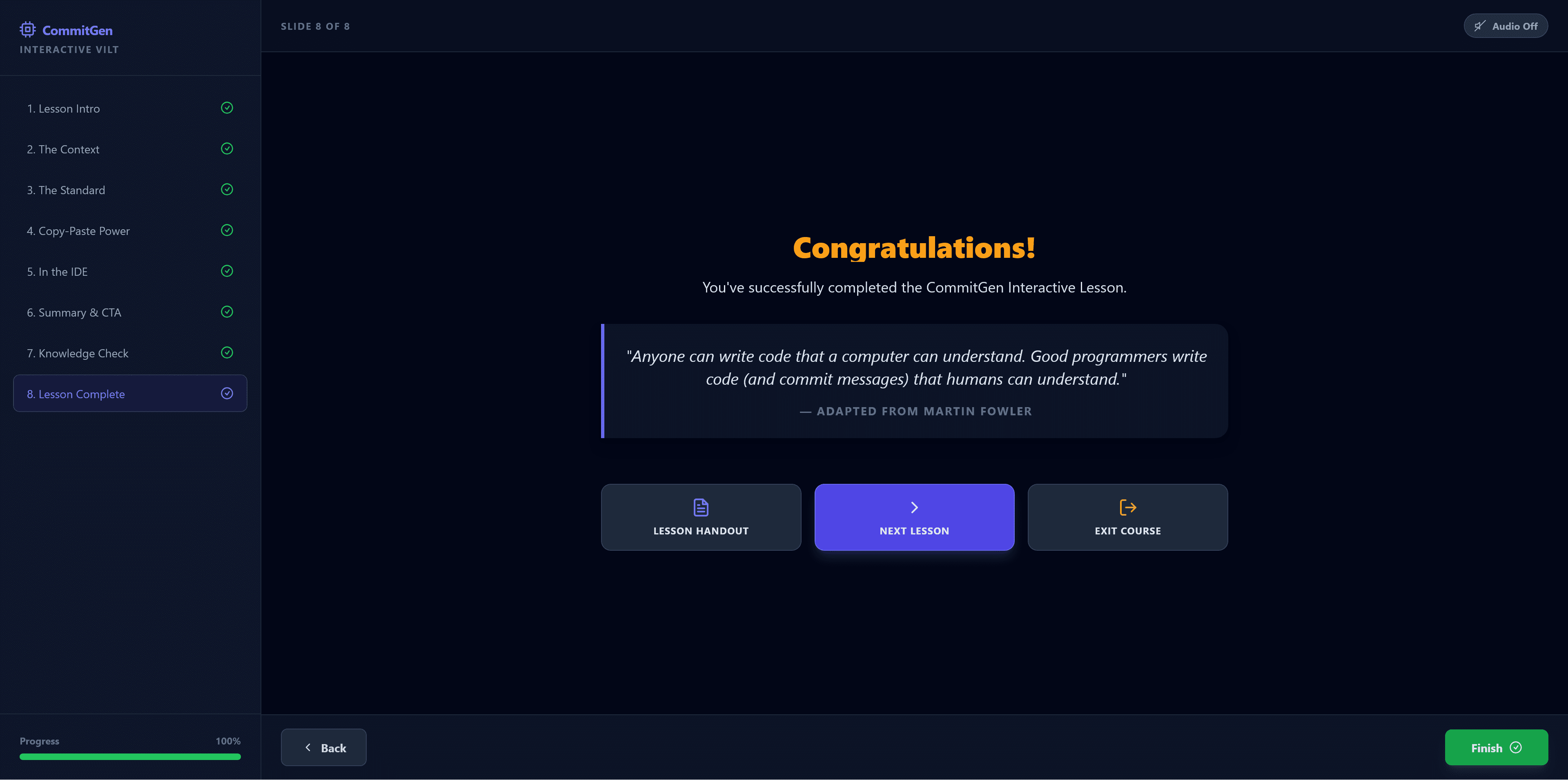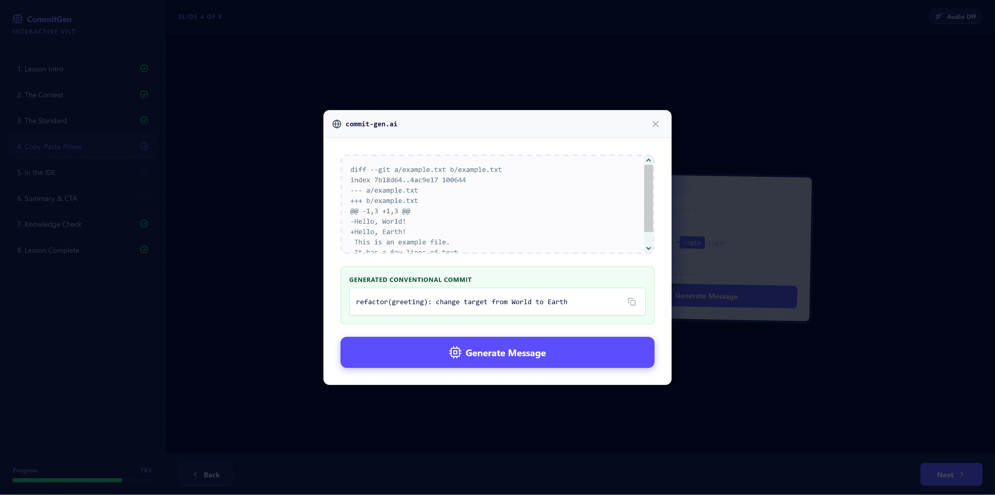 Sample Targeted Content: Junior developers often struggle with "professionalism" in their contributions. By framing the AI tool as a way to "Commit Like a Senior," the lesson addresses an aspirational goal while solving a technical pain point.