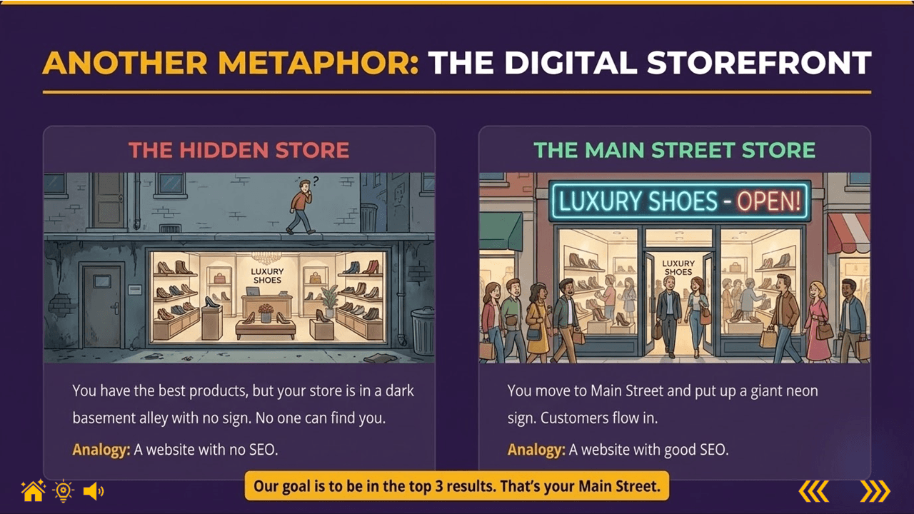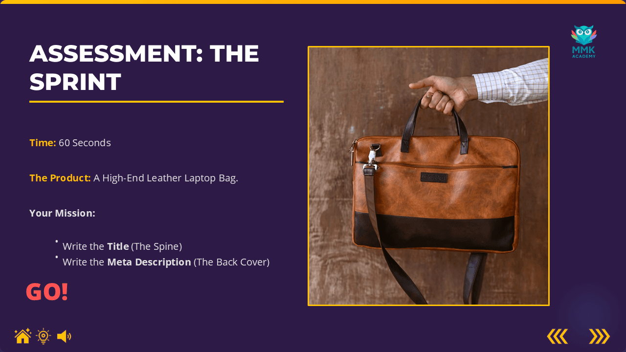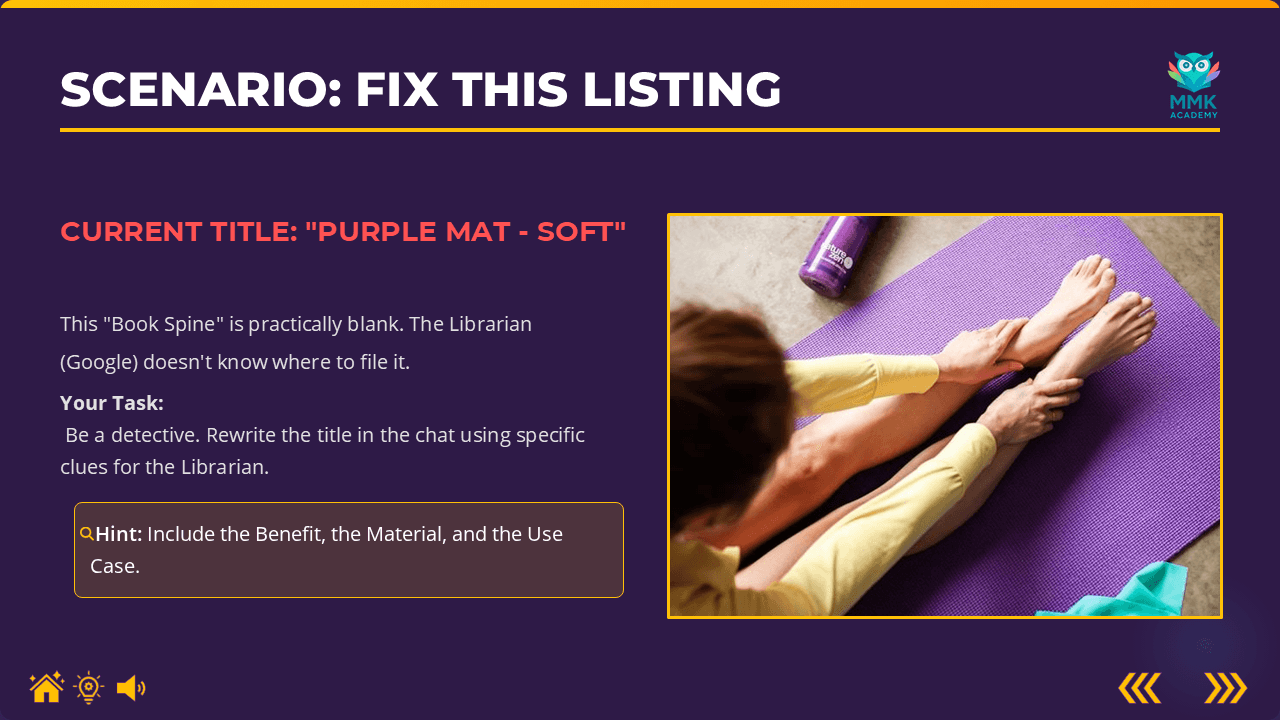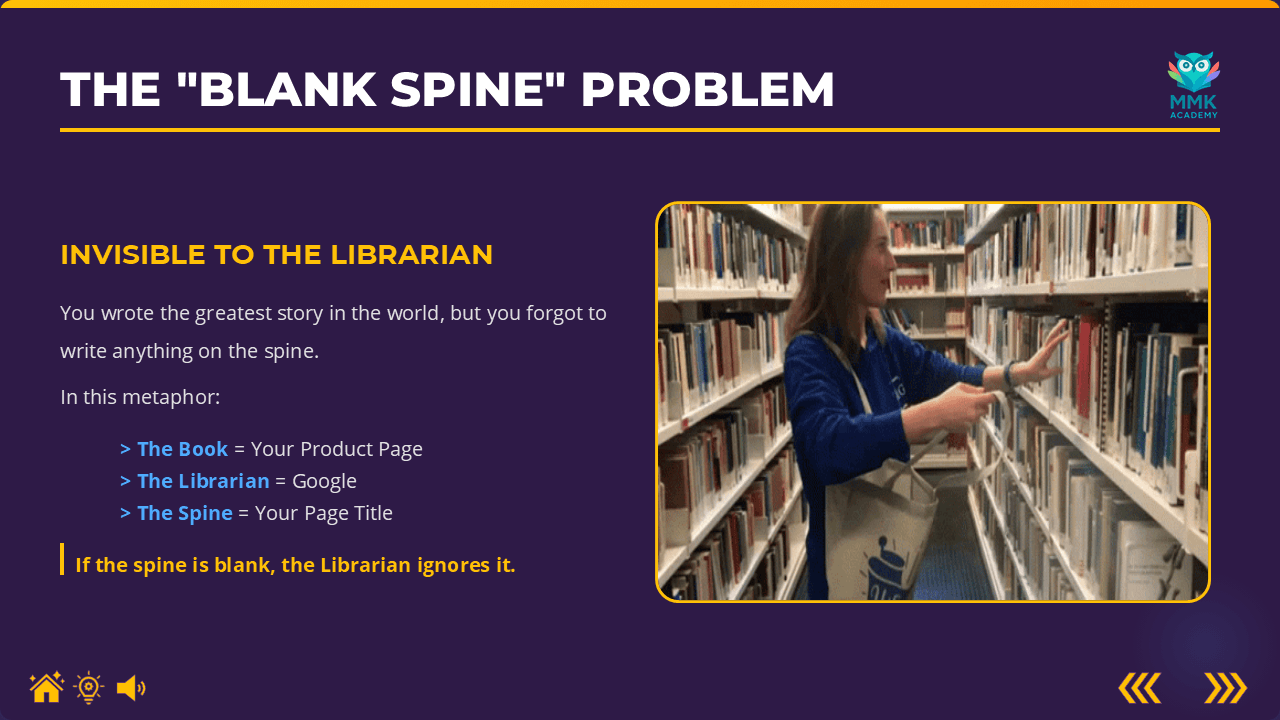 The lesson transforms the abstract concept of Search Engine Optimization (SEO) into a relatable physical experience: a library. By framing Google as "The Librarian" and product titles as the "Spine of a Book," trainees instantly grasp why vague labeling (e.g., "Purple Mat") leads to zero traffic. The module moves from metaphor to a high-intensity "SEO Sprint" assessment to ensure skill retention in under five minutes.