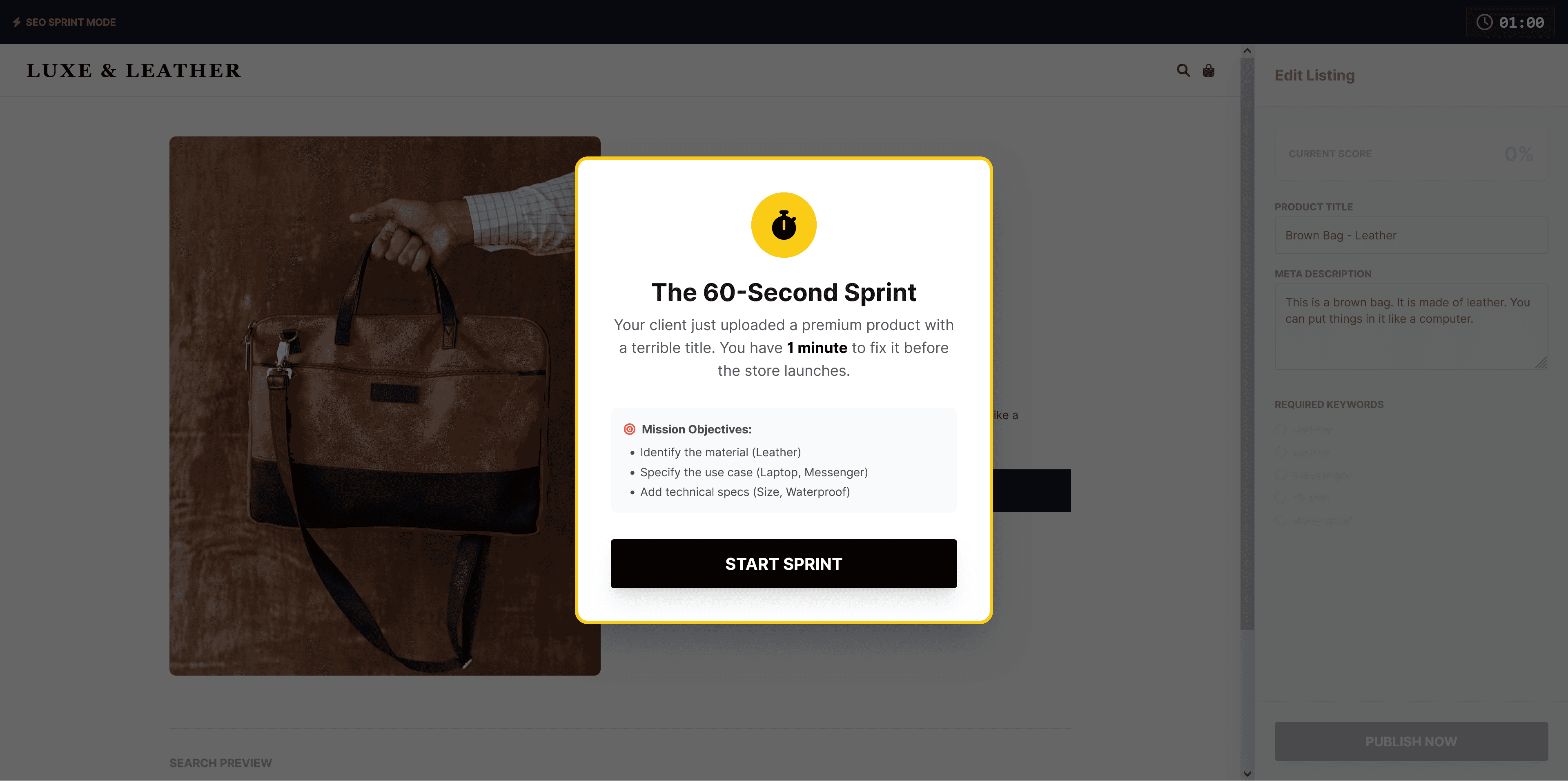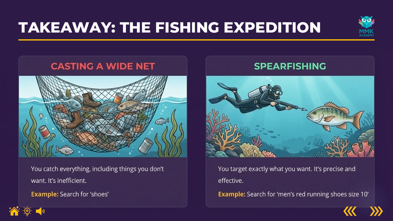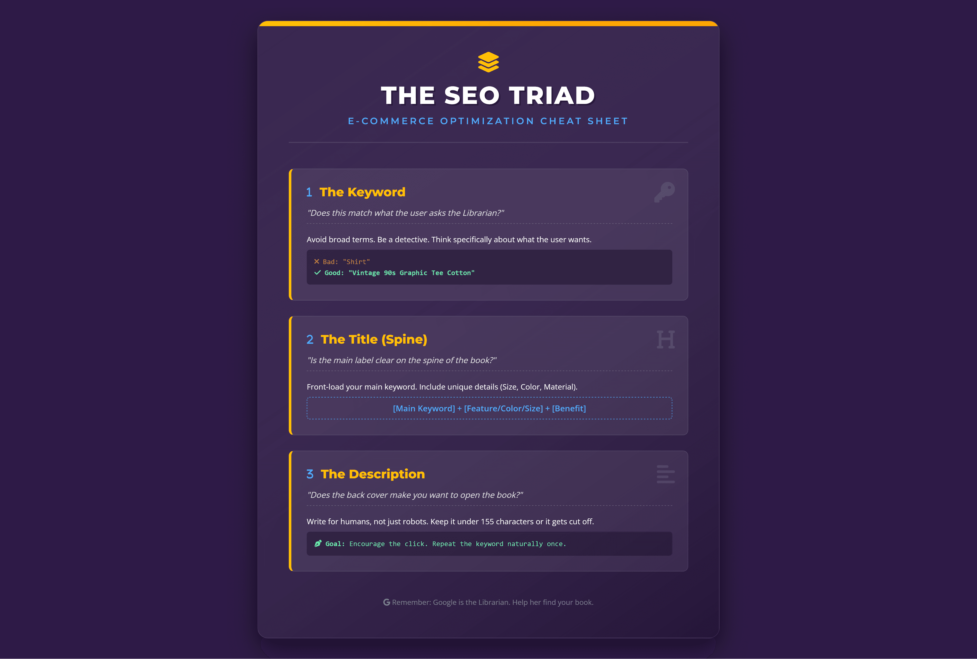 The lesson transforms the abstract concept of Search Engine Optimization (SEO) into a relatable physical experience: a library. By framing Google as "The Librarian" and product titles as the "Spine of a Book," trainees instantly grasp why vague labeling (e.g., "Purple Mat") leads to zero traffic. The module moves from metaphor to a high-intensity "SEO Sprint" assessment to ensure skill retention in under five minutes.