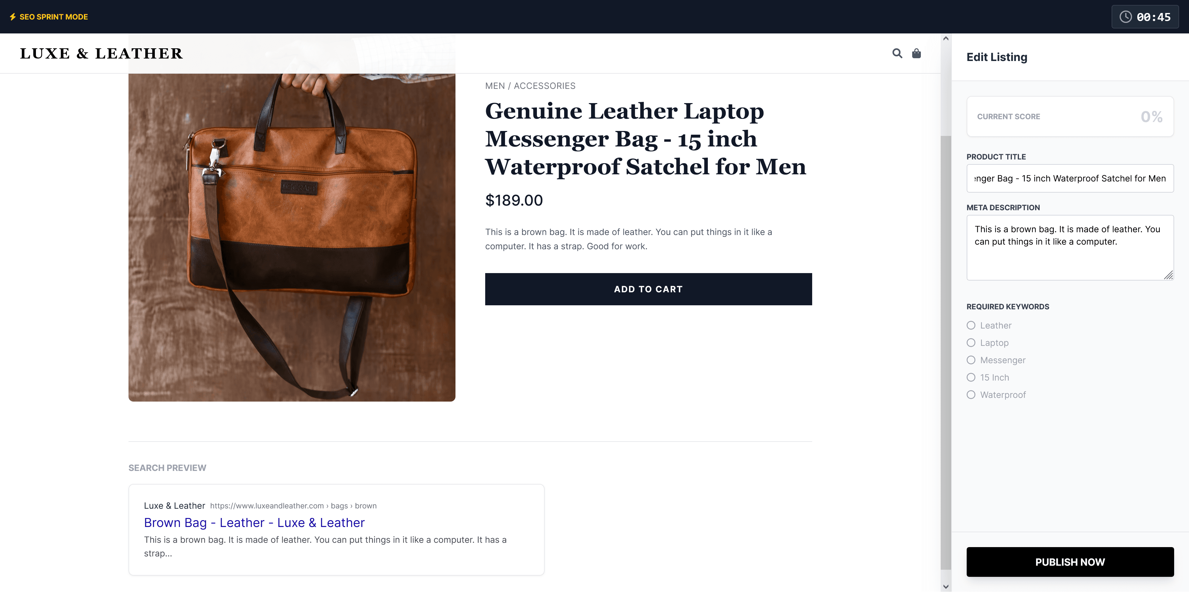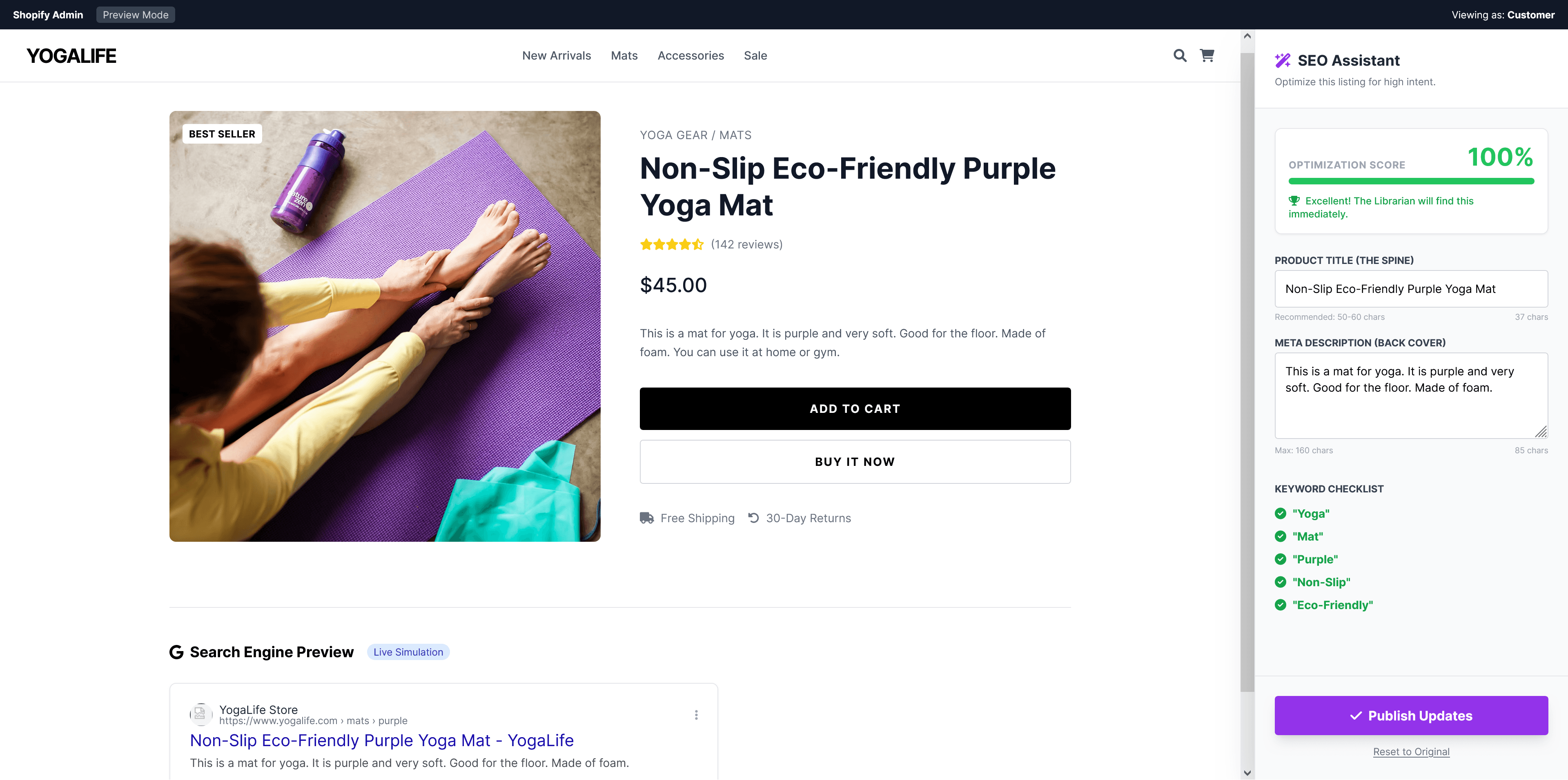 3. Workflow-Integrated Learning: The "SEO Assistant" sidebar (Image < Shopify Yoga Mats Interactive Live Simulation >) acts as a Performance Support Tool. It provides real-time feedback and a checklist while the user is "working," simulating the internal feedback loops of professional SEO tools.