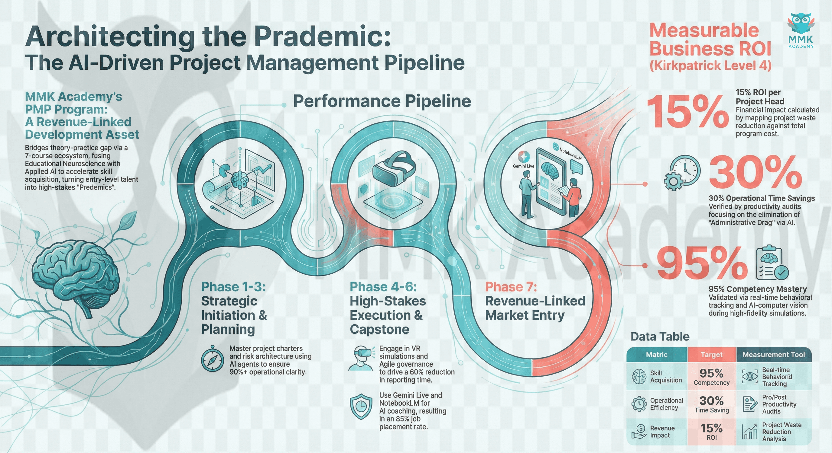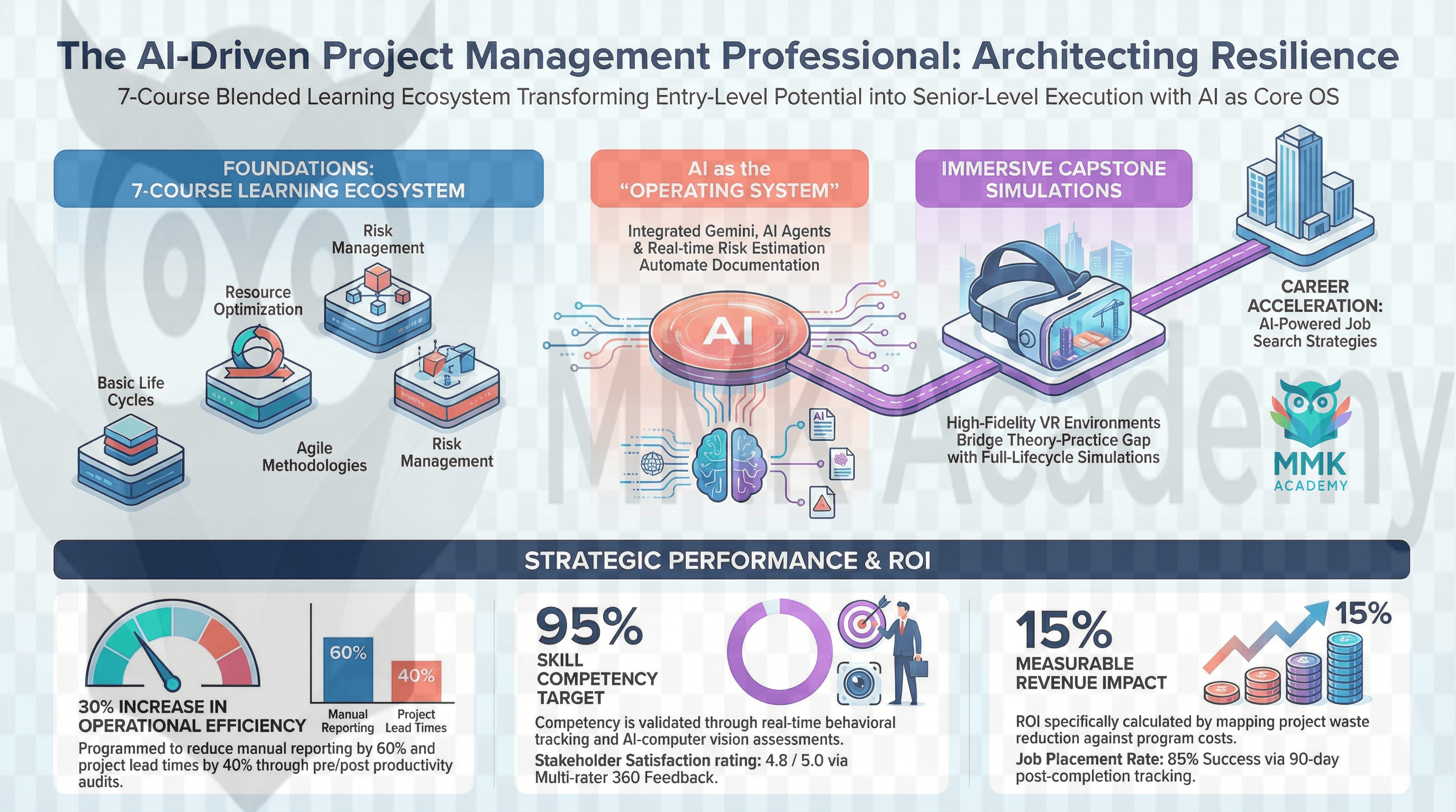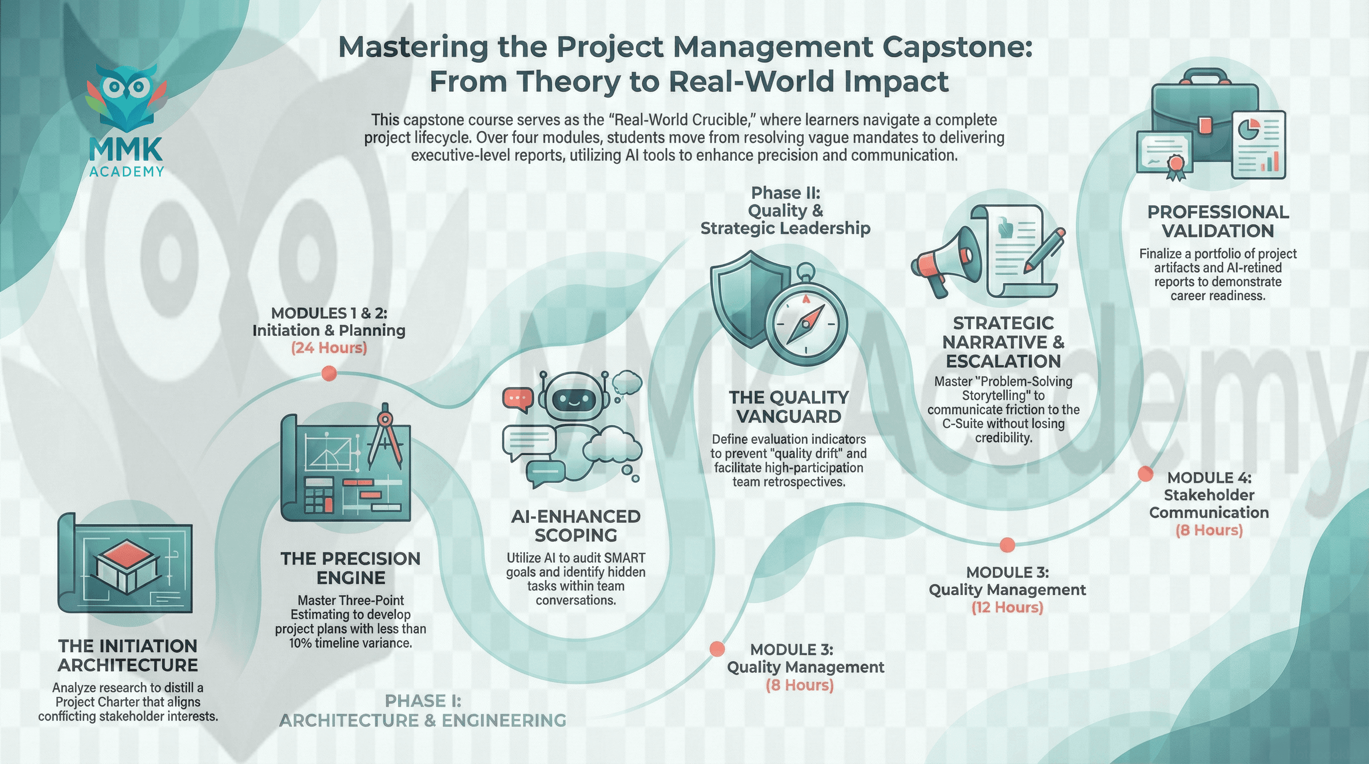 The Project Management Professional (PMP) Program is a seven-course, Revenue-Linked Development Asset engineered to transform entry-level potential into EBITDA-driving project leaders. Utilizing the 5Di Design Cycle and Cognitive Load Optimization, the curriculum bridges Educational Neuroscience with Applied AI to eliminate "Administrative Drag" and facilitate rapid skill acquisition. The program operates on a flipped-cognitive architecture, using asynchronous AI-driven microlearning for foundational knowledge and reserving live Virtual Instructor-Led Training (VILT) for high-stakes behavioral engineering. Ultimately, learners are equipped to navigate both Agile and Waterfall methodologies, culminating in a comprehensive project portfolio that validates their ability to manage stakeholders, organize plans, and communicate project details.